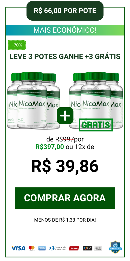 O NicoMax é protegido pela Garantia Blindada, se onde dentro de 90 dias você achar que o suplemento não fez o efeito desejado ou não apresentou nenhuma melhora em seu caso, basta entrar em contato com nossa equipe que iremos lhe devolver 100% do valor investido na hora!